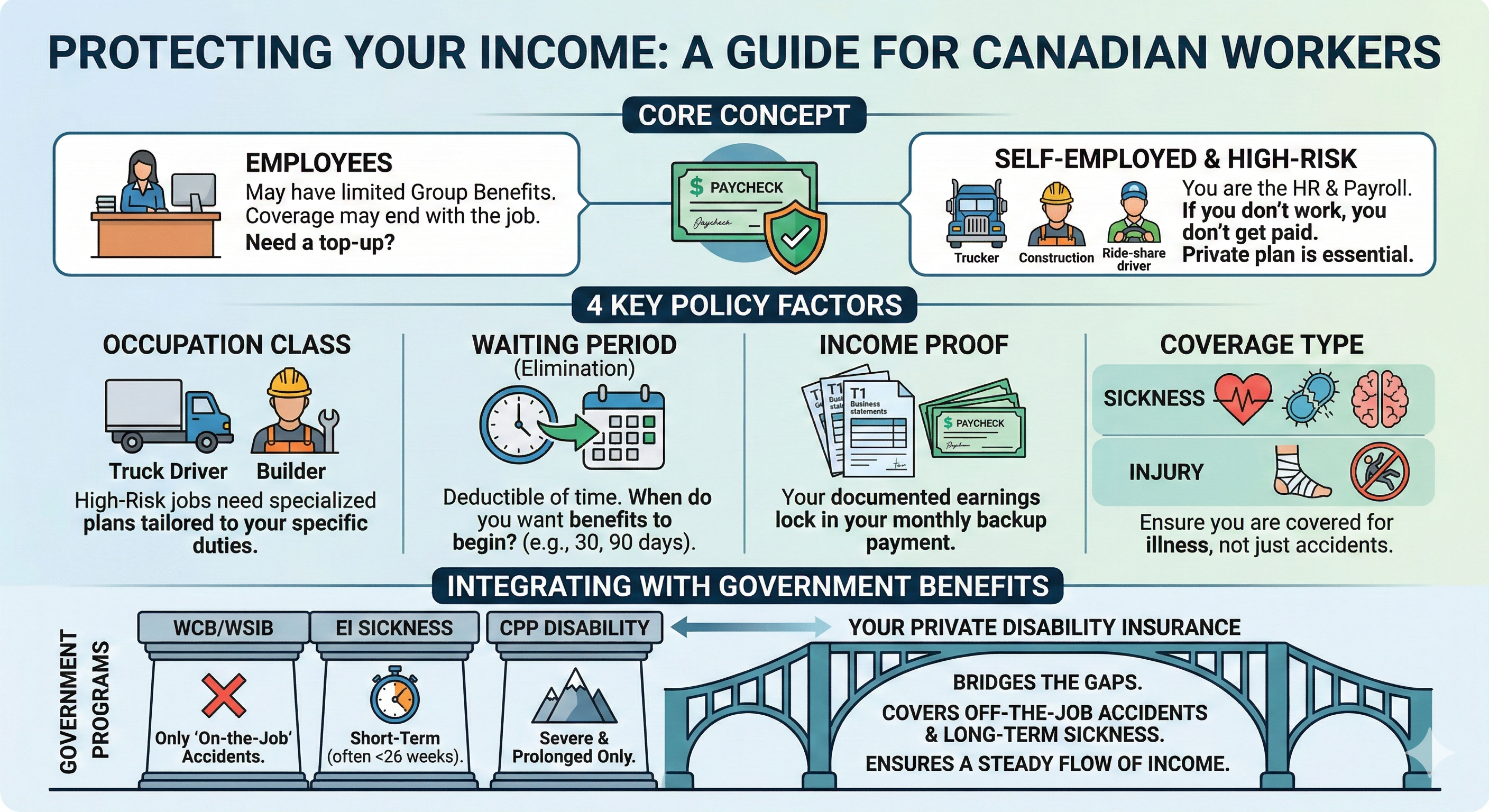 For the Self-Employed: You are your own safety net. If you don't work, the income stops, but the mortgage, truck payments, and grocery bills continue. Private disability insurance acts as a "backup paycheck" that you control.